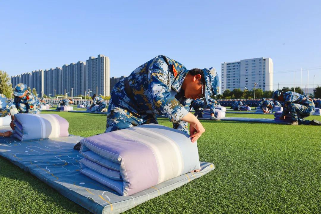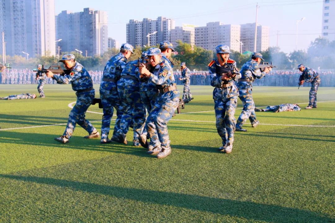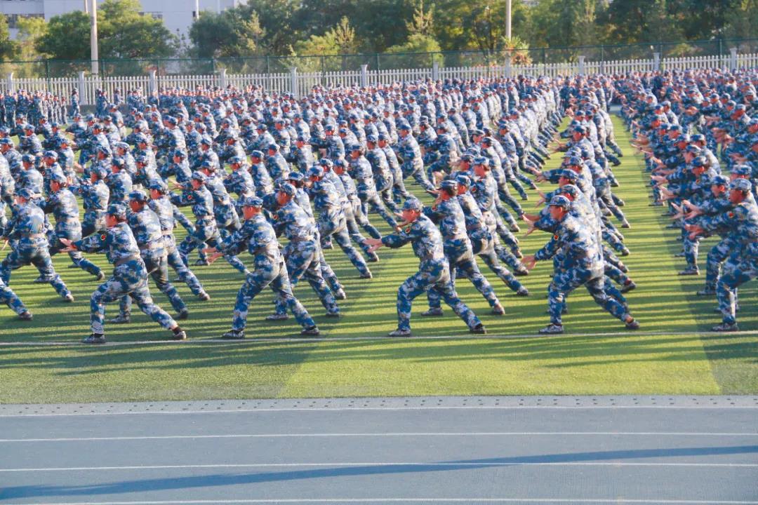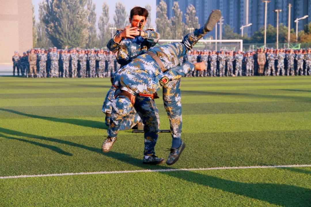 热血男儿,拟将豪情铸青春,铿锵玫瑰,且把操场当阵地。在军训科目汇报表演环节,大学新生们还进行了军体拳、内务整理、三声三项、反恐演习、海军旗语共五项科目展示。14天里,他们接受挑战、磨炼意志、蜕变自己,力争把每个动作细节做到位。拳拳生风,展现青春最帅的模样,声声喊杀,凝聚激昂澎湃的勇力。十四天的刻苦训练,在这一刻光芒四射。