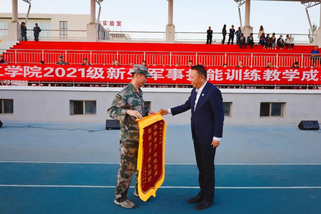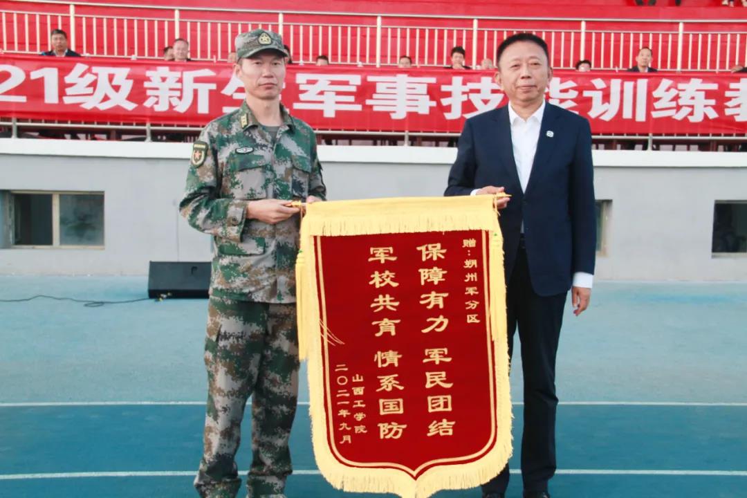 树学峰向承训部队朔州军分区赠送锦旗“保障有力,军民团结,军校共育,情系国防”,以此感谢承训部队有条不紊的训练组织,全体承训教官的辛苦付出以及14天风雨交加之中,对新生无微不至的照顾和不离不弃的陪伴。以此向所有承训教官表示衷心的感谢和崇高的敬意。
