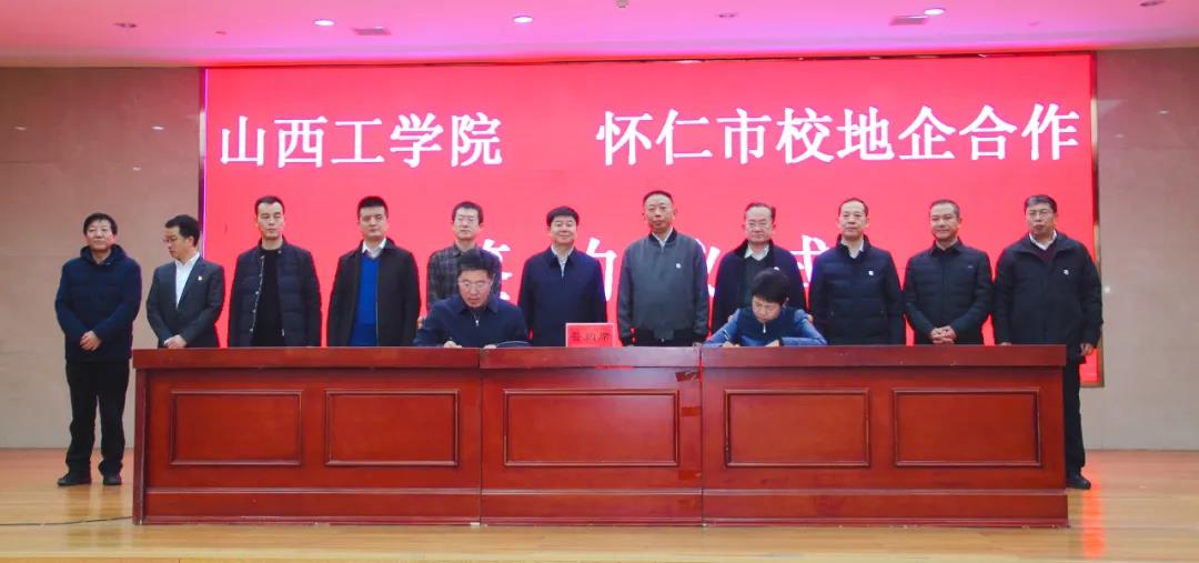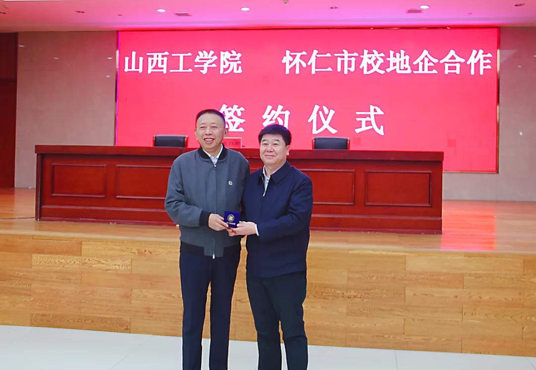 座谈结束后,我校领导将学校校徽赠送给怀仁市领导,并进行了签约仪式。我校校长吴跃焕与怀仁市副市长杨良贵签订共建大学生实训基地协议;我校材料产业学院韩涛与朔煤电宏力再生股份有限公司任志磊签订项目合作协议。