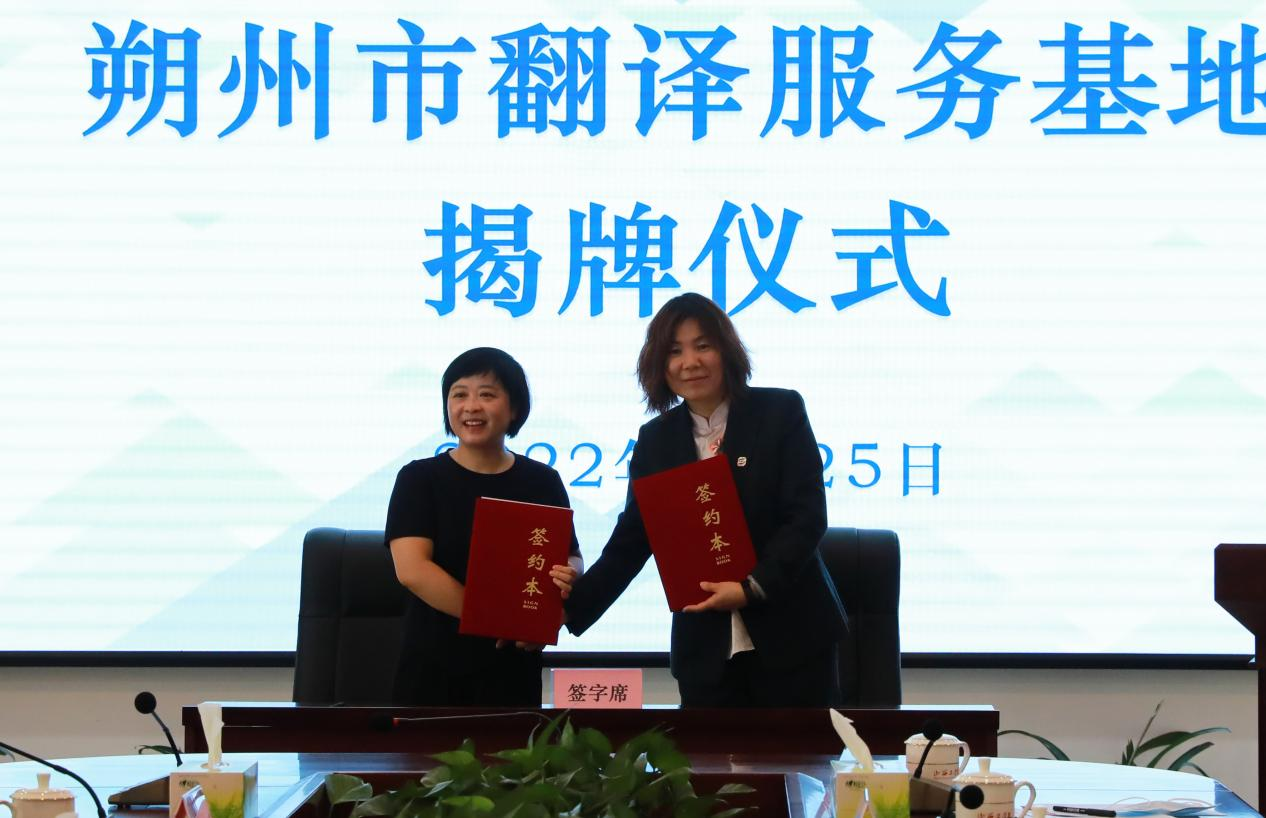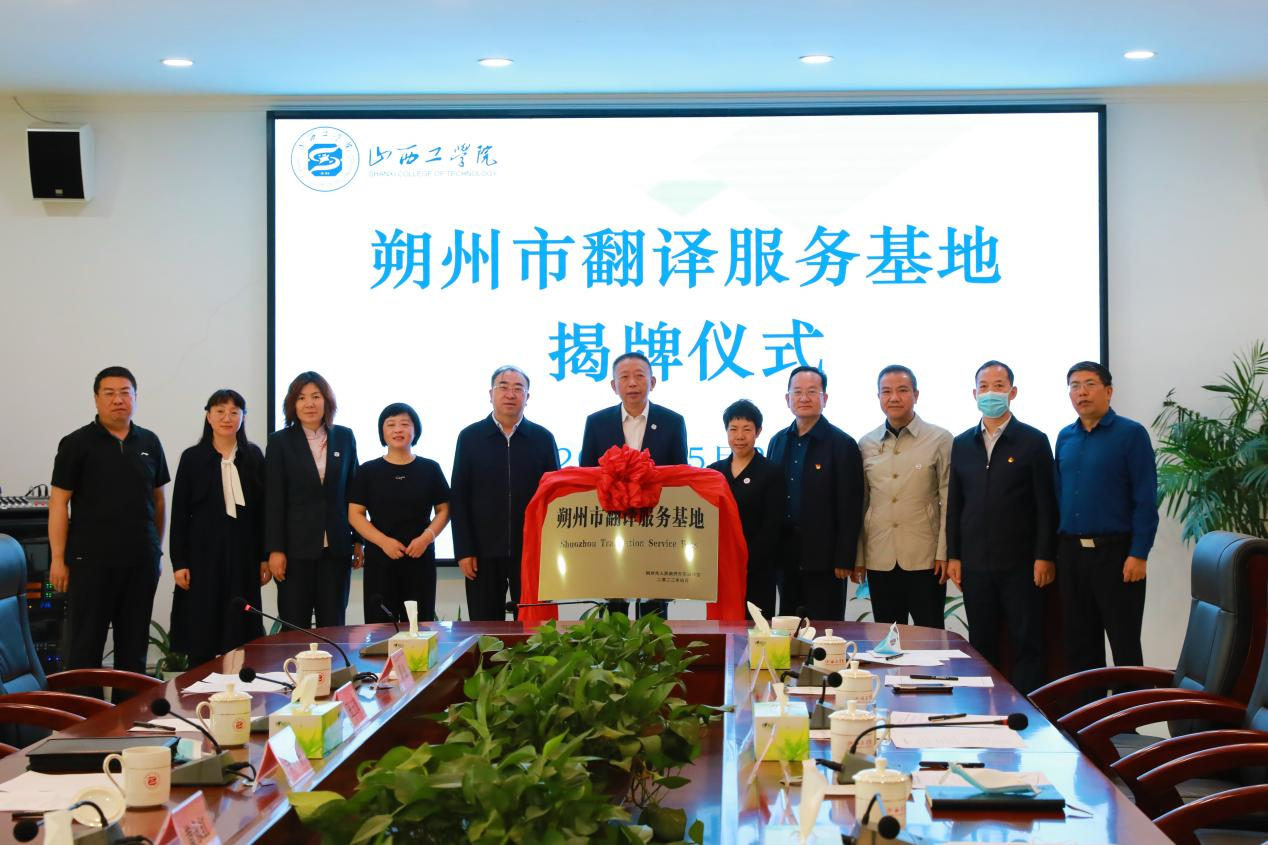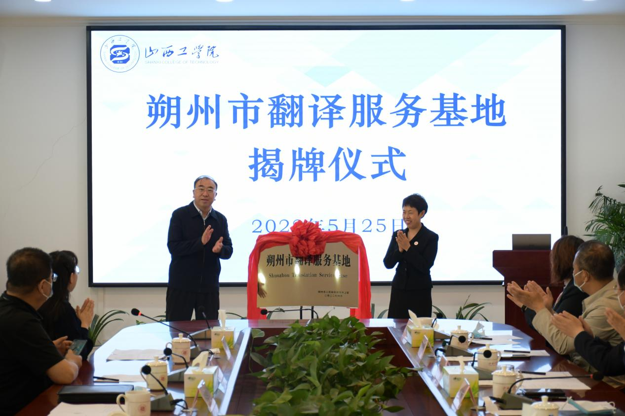 朔州市副市长李润军与yh86银河国际校长吴跃焕共同为朔州市翻译服务基地揭牌,并合影留念。