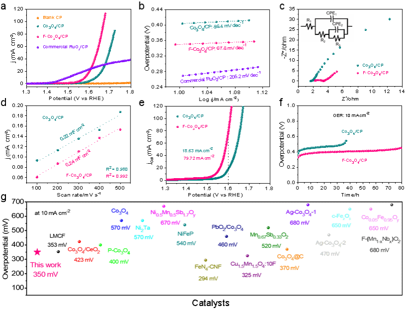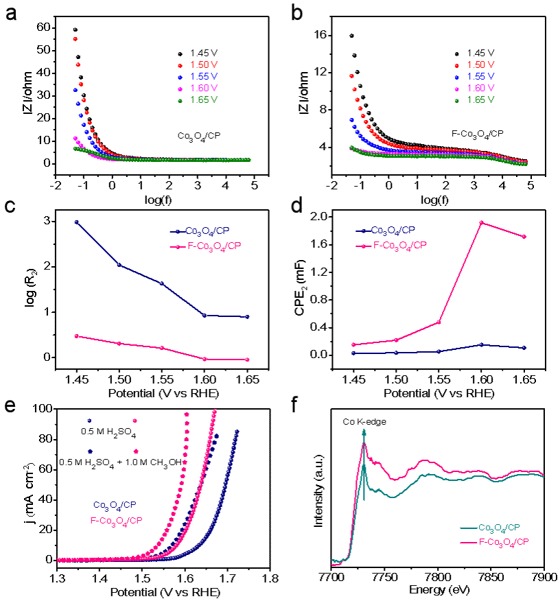 通过原位阻抗和甲醇探针实验得出F-Co3O4/CP表面可以富集更多的OH,打破了酸性环境下缺乏OH的限制,这可以极大促进OER活性的提升。另外,XPS与XAS实验进一步分析得出F-Co3O4/CP中金属Co与F之间进行快速的电子交换,并且在OER中F-Co3O4/CP更有利于生成Co3+活性中心,这共同提升了催化剂的导电性能和催化活性(图2为催化机制的证实)。