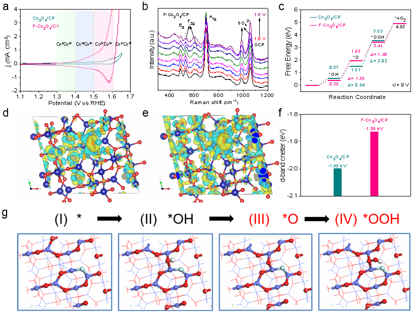 CV测试与原位拉曼光谱证实F-Co3O4/CP在酸性下具有非常优异的稳定性,这归因于在Co3O4中引入F导致更多的OH在表面生成,缓解了Co的刻蚀,从而提升了稳定性。理论计算也表明F-Co3O4/CP中有强的OH的吸附能,有利于OH的吸附,与实验结果一致。并且F-Co3O4/CP的d带中心接近费米能级更有利于电子的转移,以及整体反应中的限速步骤能垒得到了优化,这都证实在Co3O4中引入F可以极大地提升反应效率(图3为催化剂在性能测试期间的结构表征与理论计算)。