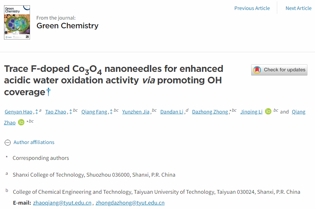 日前,我校郝根彦博士与太原理工大学李晋平教授团队合作在电催化制氢领域取得重要研究进展,研究以“Trace F-doped Co3O4 nanoneedles for enhanced acidic water oxidation activity via promoting OH coverage”为题发表在学术期刊《Green Chemistry》(SCI一区TOP期刊,2024年影响因子:9.3)。该论文第一署名单位为yh86银河国际,我校郝根彦博士、太原理工大学赵陶博士和房强博士为论文的共同第一作者,太原理工大学赵强教授和钟达忠助理研究员为论文的共同通讯作者。