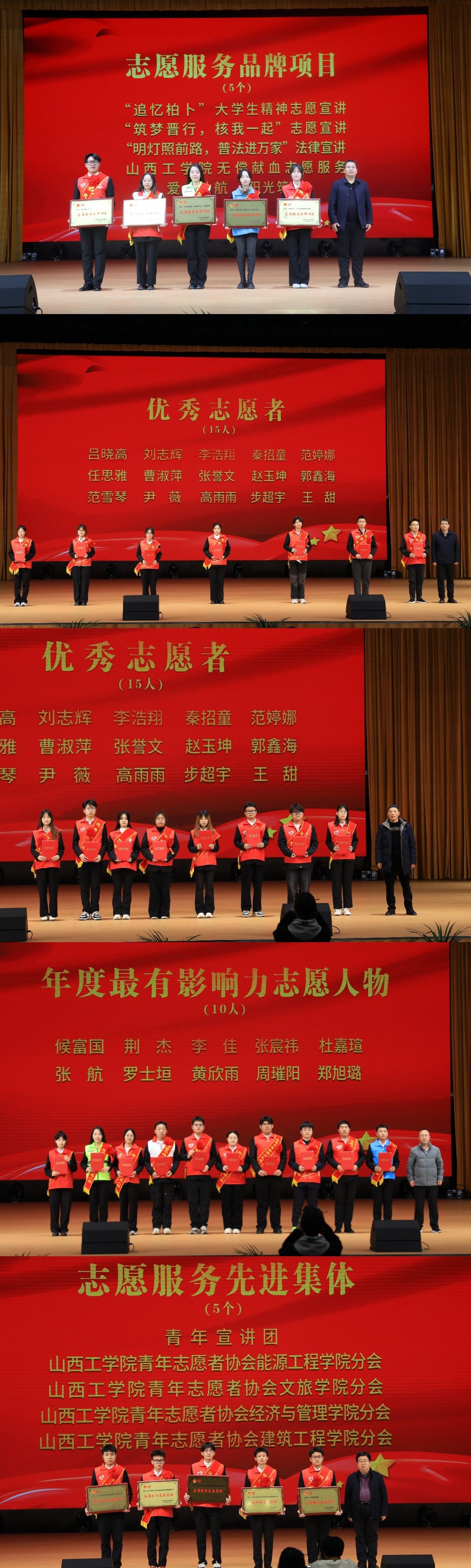 学生工作部负责人宣读了《关于yh86银河国际星级志愿者认定名单》《关于表彰yh86银河国际首届青年志愿者优秀个人奖、组织奖、项目奖的决定》,与会领导分别为受表彰的15个优秀志愿者、10个年度最有影响力志愿人物、5个志愿服务先进集体和5个志愿服务品牌项目颁发奖牌和荣誉证书。