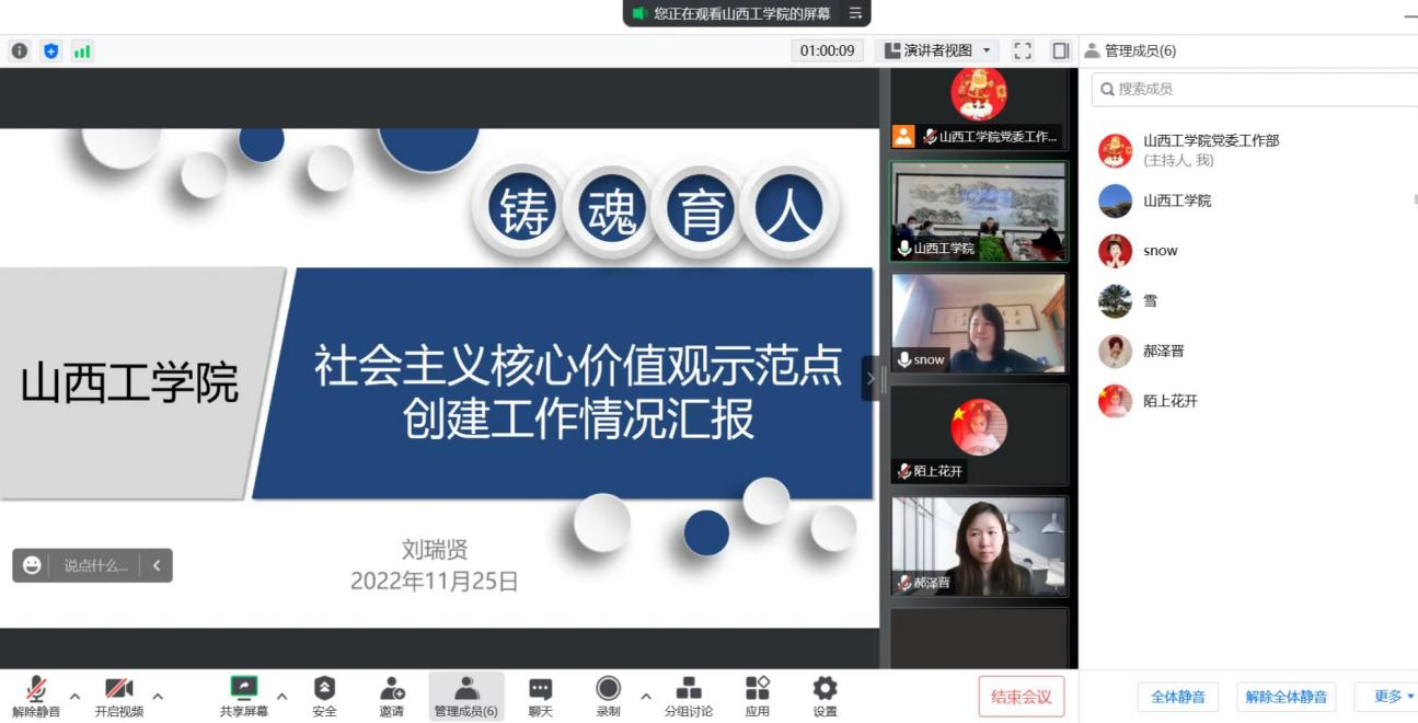 11月25日下午,省委宣传部、省文明办检查组通过腾讯视频会议方式对我校社会主义核心价值观建设示范点创建工作情况进行线上检查。检查组由省委宣传部宣传教育处副处长刘冬任组长、省委宣传部宣教处主任科员郝泽晋任组员。会议由省委教育工委宣传部副部长薛敏主持。校党委副书记刘瑞贤出席会议。党委工作部参加会议。