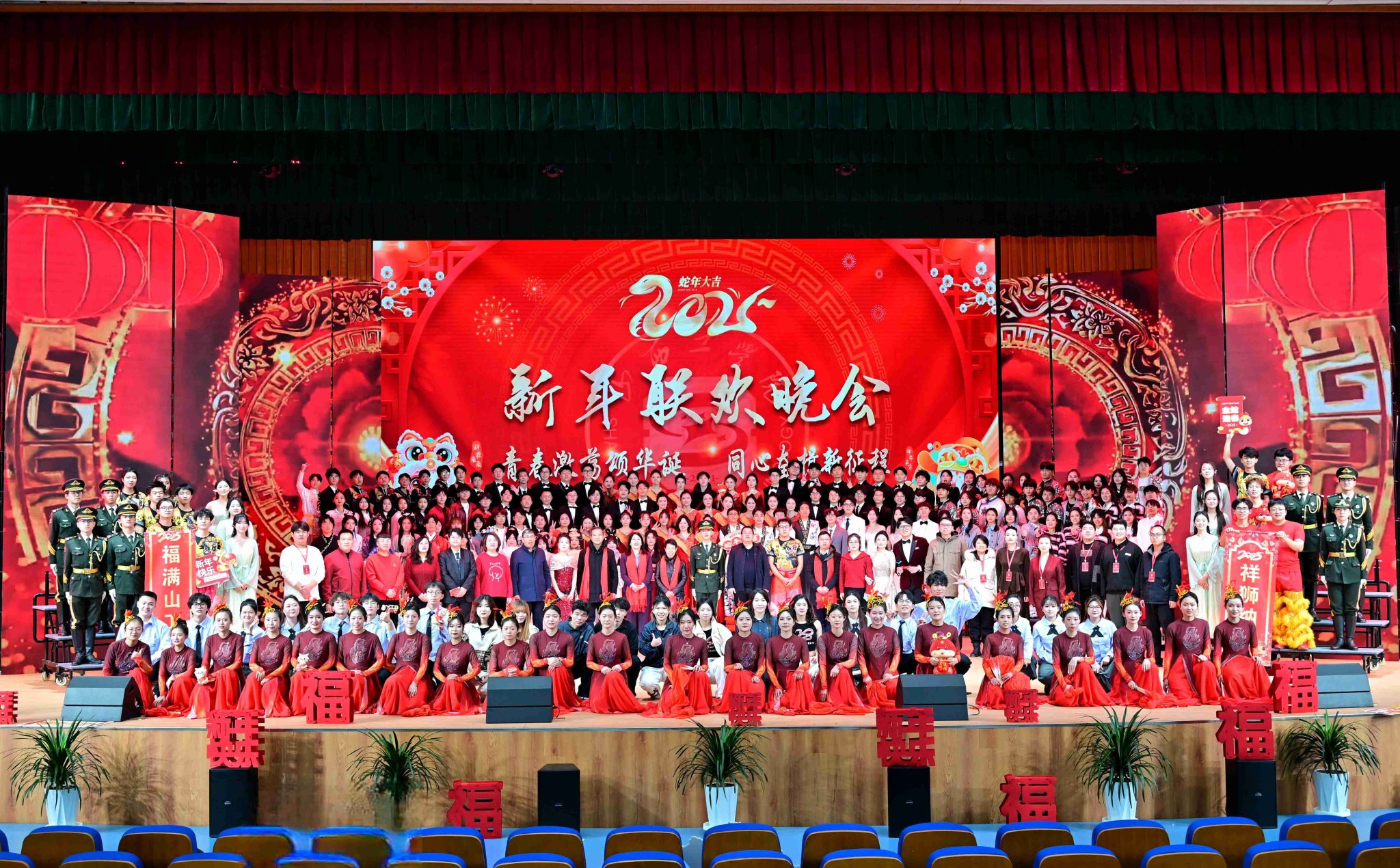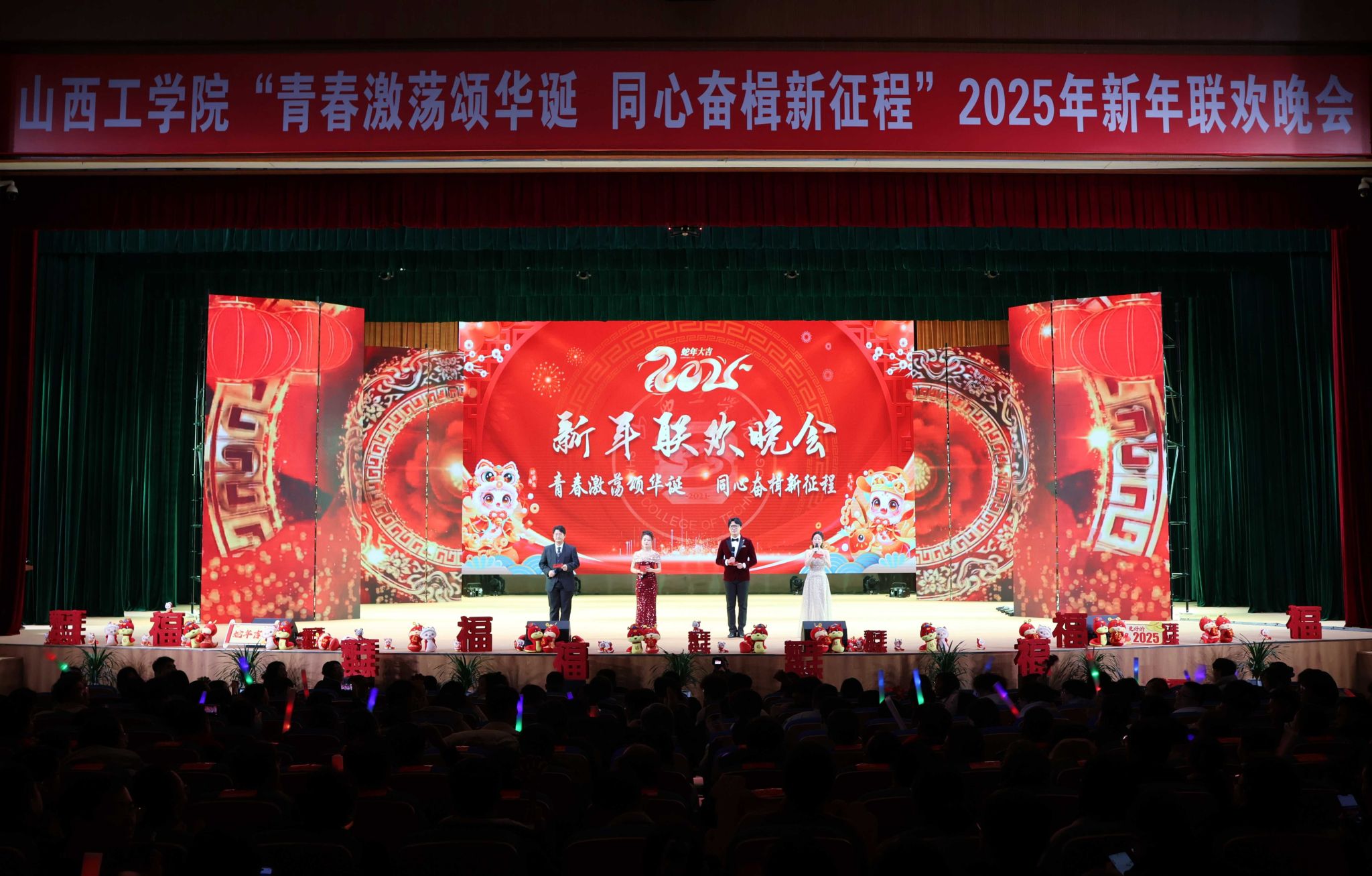 祥龙辞岁,奋楫扬帆耀华年;金蛇贺新,筑梦远航续华章。12月30日晚,我校在问道会堂举行“青春激荡颂华诞 同心奋楫新征程”2025年新年联欢晚会。朔州军分区、朔州市教育局、武警朔州支队、朔州市公安局交警队、朔州市大医院、朔城区人民武装部、北旺庄派出所等单位受邀出席联欢晚会。校长吴跃焕,校党委副书记刘瑞贤、孙刚,校纪委书记贾俊敏,副校长田忠刚、郝根彦、李怀繁参加晚会,各职能部门负责人,各二级学院院长/党务临时负责人及师生代表欢聚一堂,一同辞别旧岁,喜迎新年。
