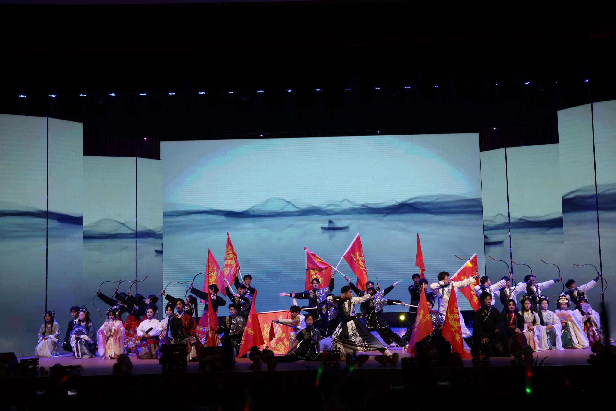 电吉他手激情演奏《云宫讯音》,弦音如雷,声声震耳。舞者身姿灵动,衣袂飘飘,与激昂乐声交织辉映。节奏明快有力,旋律扣人心弦,一场视听盛宴在音符与舞步中热烈展开。