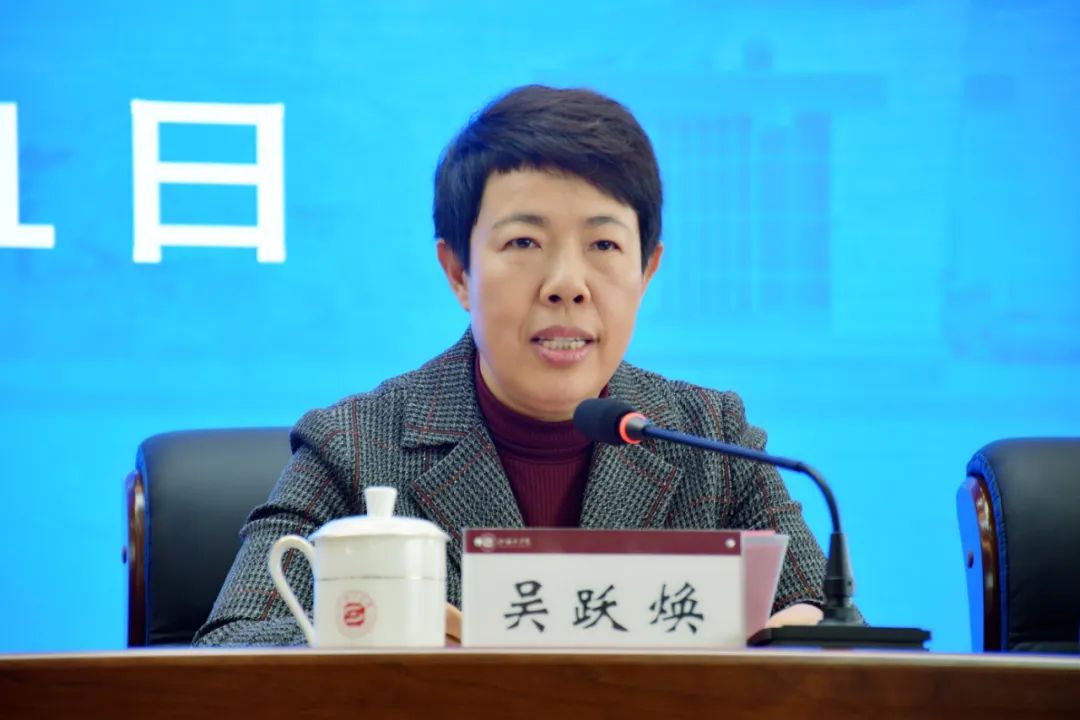 吴跃焕作总结讲话。她指出,2023年是贯彻党的二十大精神的开局之年,也是实施“十四五”规划承上启下的关键之年,是“两个大局”加速演进,疫情防控进入新阶段,机遇挑战并存,机遇大于挑战的关键一年。全校上下要提高站位,切实将思想和行动统一到学校的部署和要求上来,围绕《学院2023年工作要点》和《工作目标责任书》,以高度的责任心和事业心,全力推进年度各项工作。一是要旗帜鲜明讲政治,要始终坚持从政治上看待问题、分析问题、判断问题、解决问题,要把凡事讲政治的鲜亮底色体现到工作的方方面面,确保学校始终成为坚持党的领导的坚强阵地。二是要提振士气聚合力,要善用兄弟部门之力,协同联动,形成工作合力;要善学兄弟院校之质,学习借鉴好的经验做法;要善借政府之源,多争取、多沟通、多汇报,推动政府以更大的决心更多的精力支持学校事业发展。三是要担当作为抓落实,要全面破解能力不足之痛,做到脑子有思路,手上有招数,脚下有路子,要凭实干立身,用成绩说话,以实际行动全方位推进学校高质量发展。