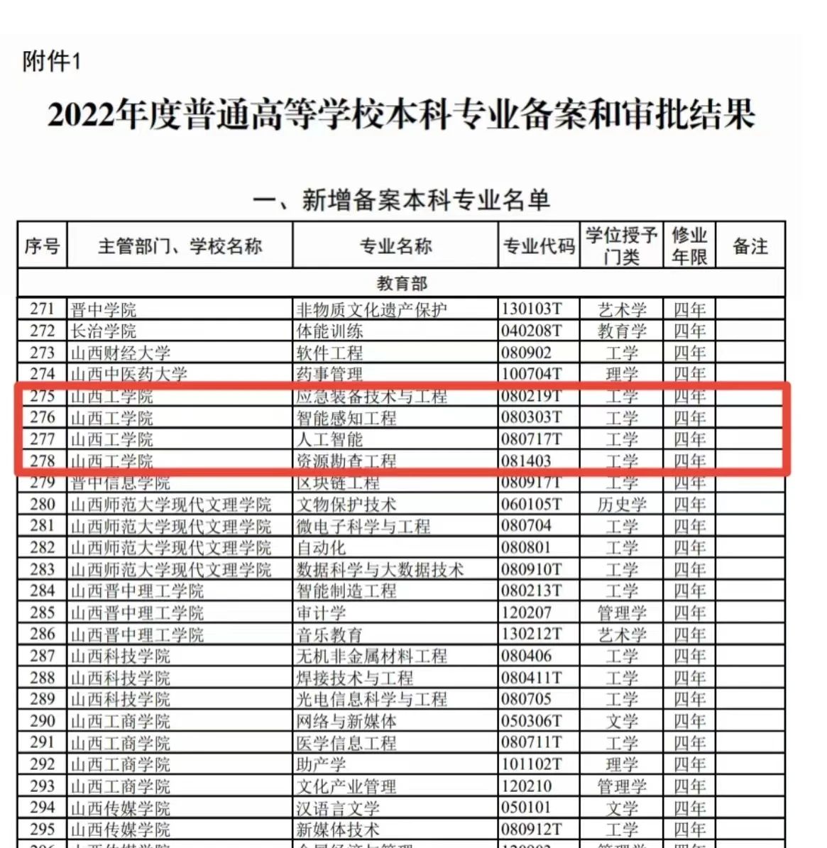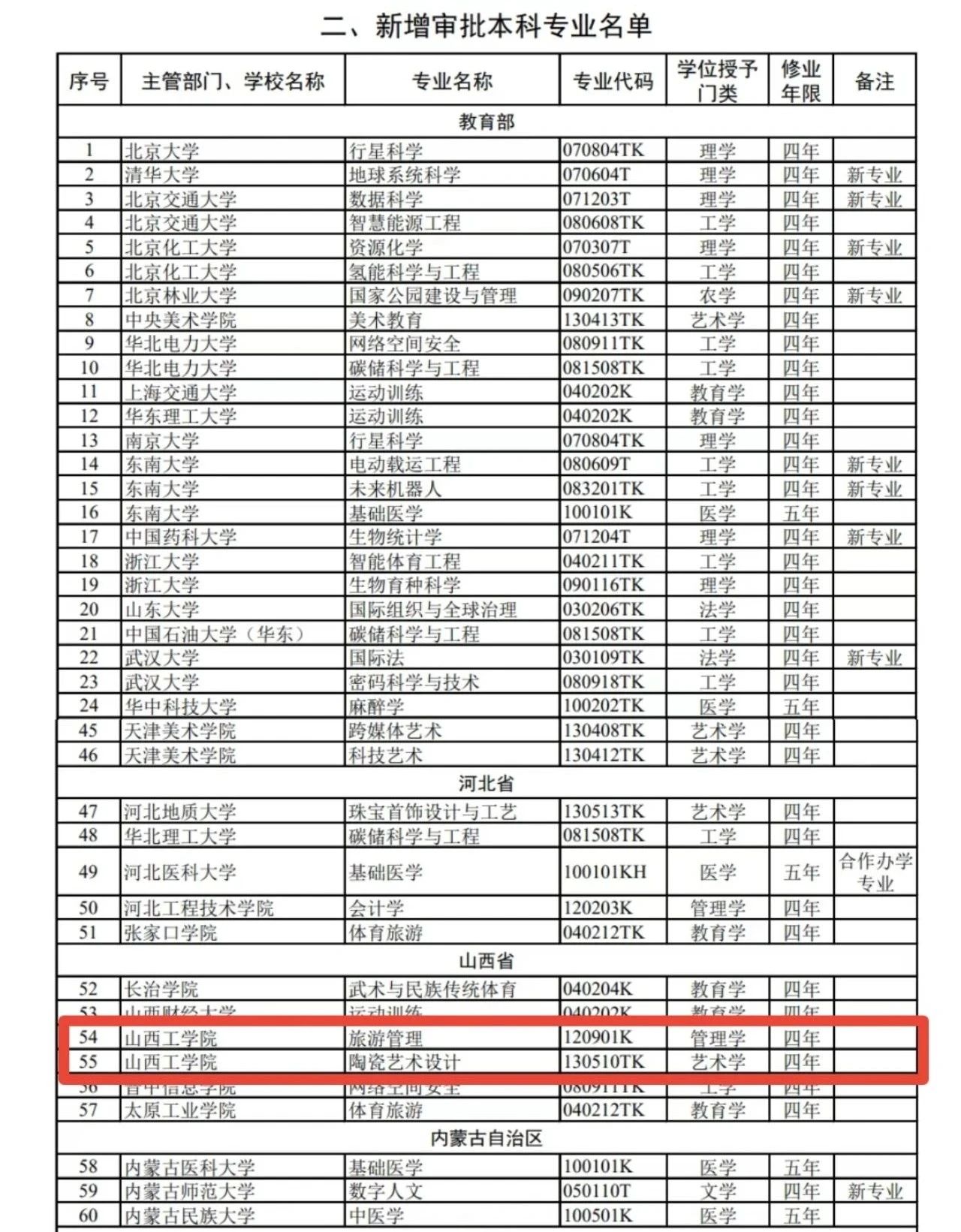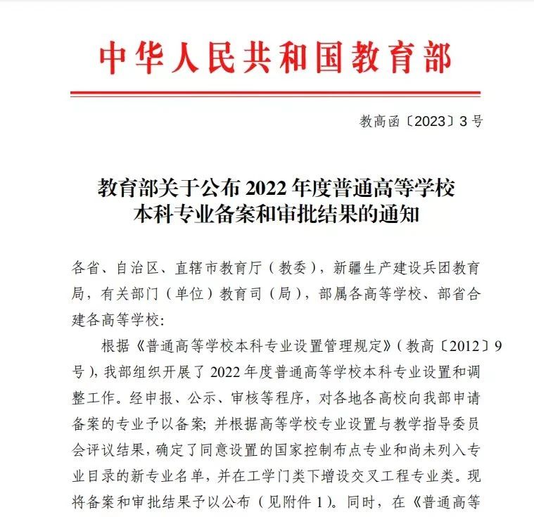 近日,教育部公布了2022年度普通高等学校本科专业备案和审批结果,yh86银河国际新增4个备案本科专业,分别为应急装备技术与工程、智能感知工程、人工智能、资源勘查工程,新增2个审批本科专业,分别为旅游管理、陶瓷艺术设计专业学制均为四年。