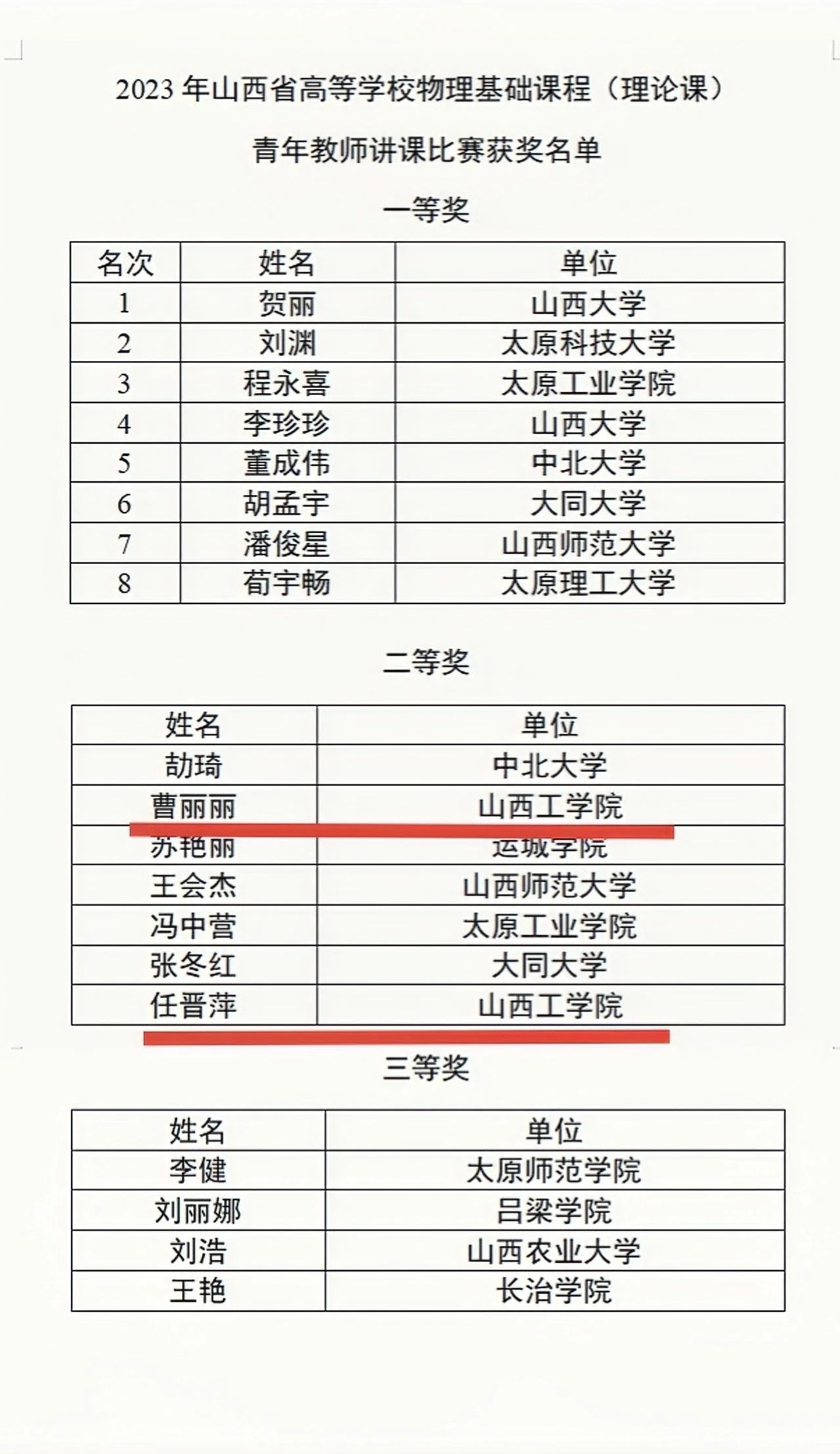 5月27日,2023年全国高等学校物理基础课程青年教师讲课比赛(山西赛区初赛)在山西大学举行。经过多轮激烈角逐,我校通识教育学院青年教师曹丽丽和任晋萍凭借扎实的理论功底和生动精彩的讲授获得了专家评委们的一致好评,均荣获比赛二等奖,充分展示了我校青年教师的良好教学风采。