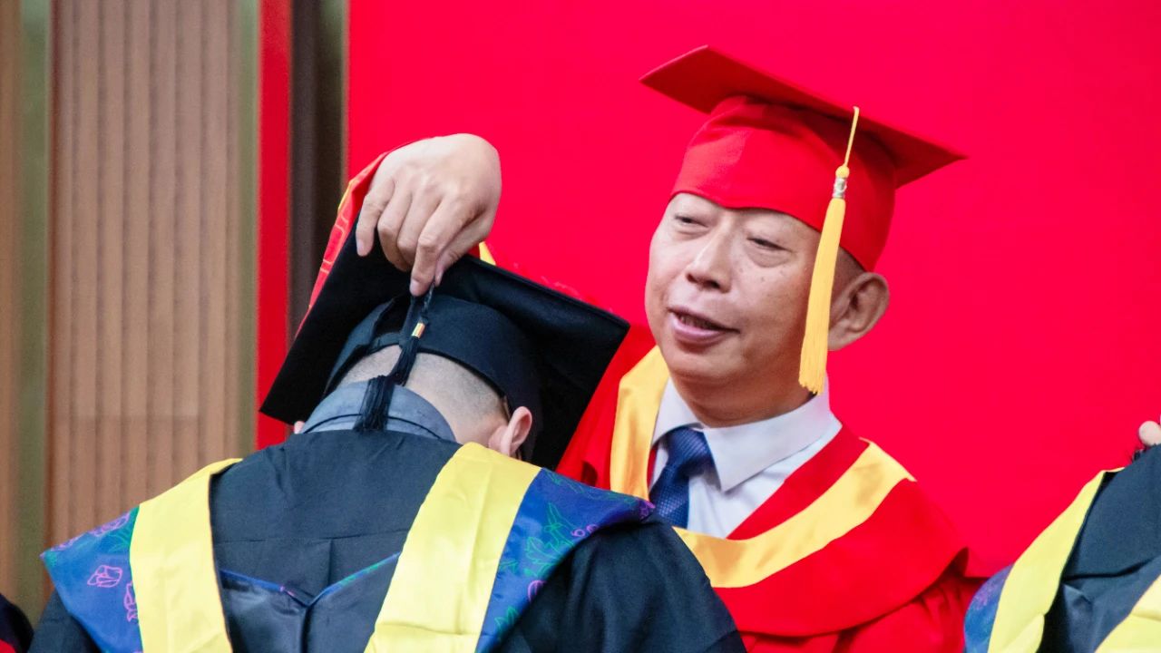 校学位评定委员会成员依次与每一位毕业生握手致贺,校领导为他们正冠拨穗、颁发学位证书,并进行合影留念。帽穗从右到左,拨过大学两年的点滴时光,在祝福和掌声中掀开人生新的篇章。