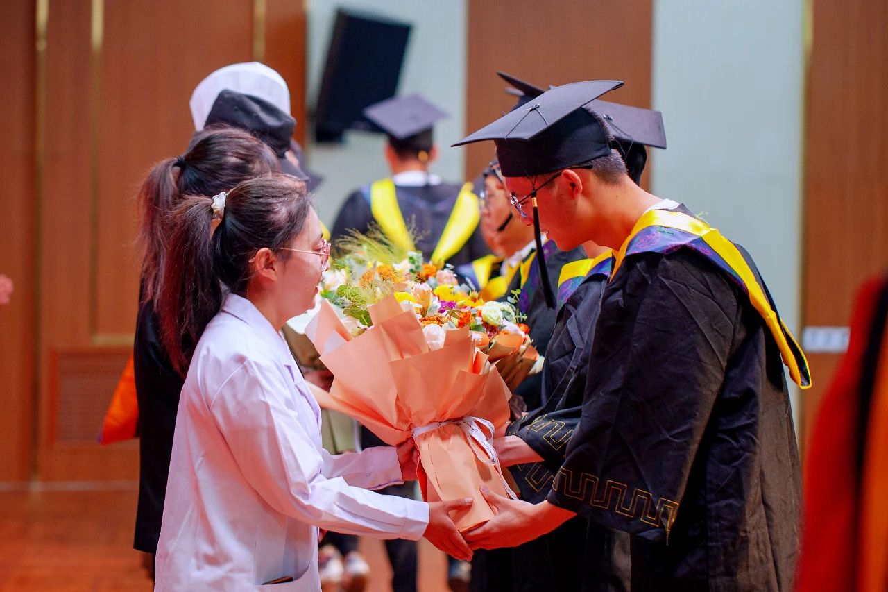 毕业生代表为教职工代表、服务保障人员代表、与会领导、嘉宾和老师们敬献鲜花,表达他们对全校教职员工两年教导、陪伴、关怀和帮助的感激之情。