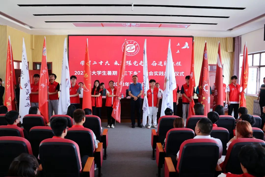 团朔州市委副书记欧布力宣读了《学院2023年大学生“三下乡”暑期社会实践重点团队名单》。他希望同学们弘扬奉献、友爱、互助、进步的志愿精神,坚持与祖国同行、为人民奉献,以青春梦想、用实际行动为实现中国梦作出新的更大贡献。用青春的行动践行“请党放心、强国有我”的铮铮誓言。