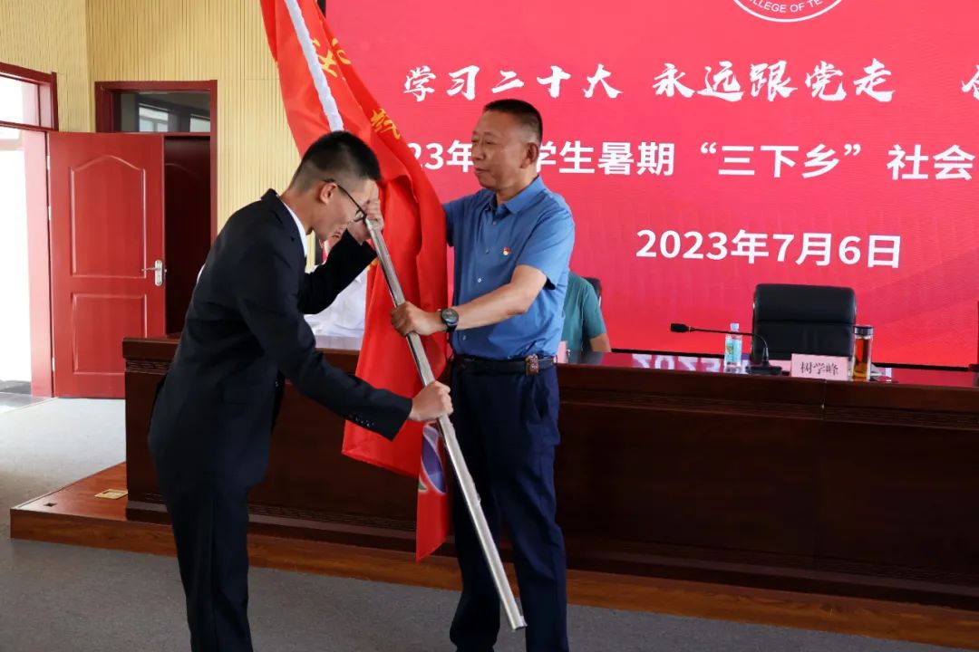 树学峰为各社会实践代表队分别授旗。伴随着嘹亮的音乐,飞舞的旗帜在会场飘扬,彰显着我校青年学生将会以饱满的精神和高昂的斗志投入到暑期“三下乡”社会实践活动中去,在时代大舞台上挺膺担当、建功立业。征途在星辰大海,潮涌于壮阔山河,在场的每一位同学都充满斗志,做好了贡献青春力量的准备!