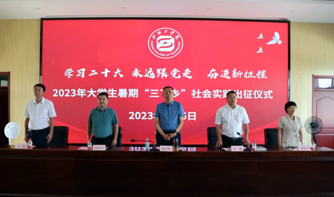 7月6日下午,我校在治学楼四层学术报告厅举行2023年大学生“三下乡”暑期社会实践出征仪式。校党委书记树学峰、校党委副书记孙刚出席仪式。团朔州市委副书记欧布力、团朔州市委学校部部长田步升受邀出席活动。学生工作部(团委)全体成员、各二级学院学生工作负责人、全体辅导员、社会实践指导教师、社会实践队员代表参加本次活动。仪式由孙刚主持。