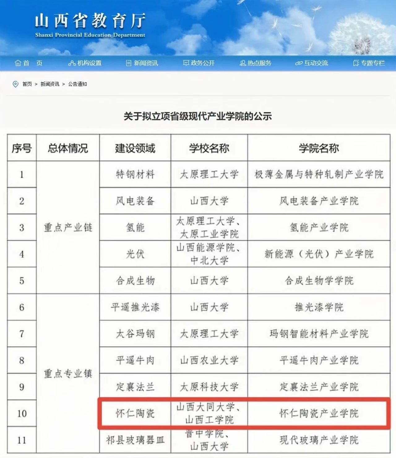 近日,山西省教育厅发布“关于拟立项的省级现代产业学院的公示”,经组织评审,拟立项11个省级现代产业学院。我校陶瓷产业学院成功获批省级现代产业学院。