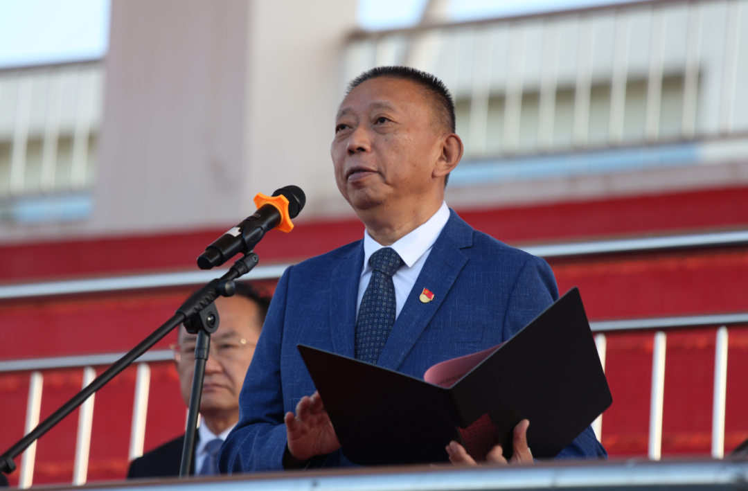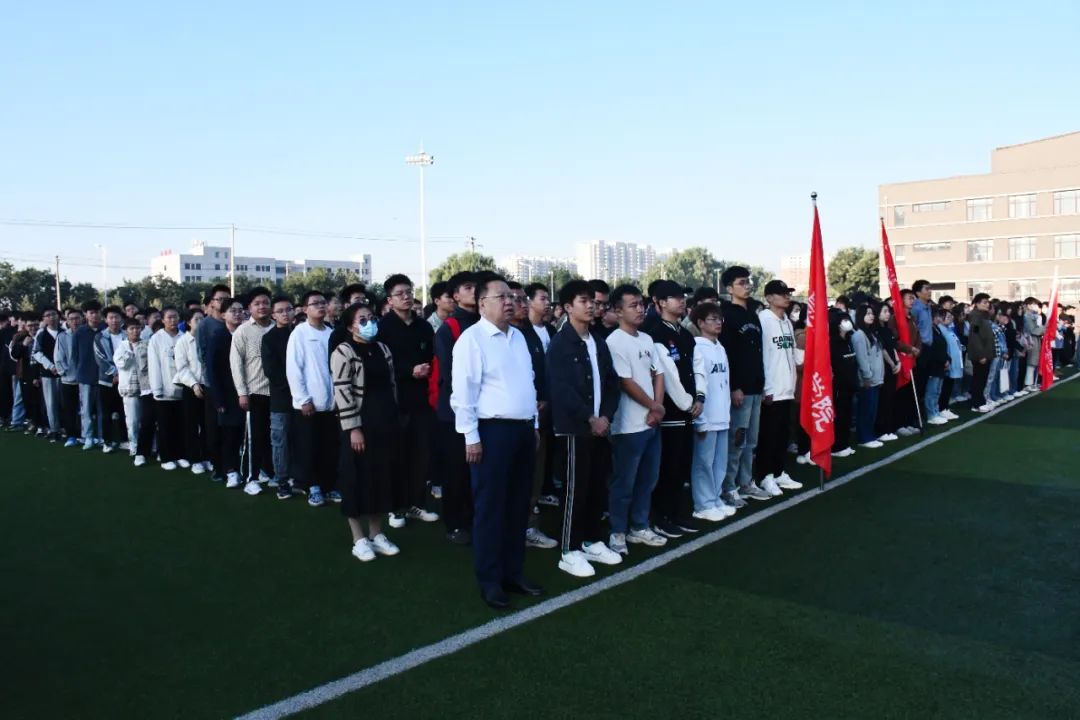 初秋如画,共赴新程。9月4日,正值新学期正式上课的第一天,我校在田径场隆重举行2023年秋季学期升旗仪式。校党委书记树学峰,校长吴跃焕,校党委副书记刘瑞贤、孙刚,校纪委书记贾俊敏,副校长田忠刚、郝根彦出席仪式。各相关职能部门临时负责人、二级学院院长、党务临时负责人、学生工作部全体成员、全体辅导员、教师代表、2021级学生骨干代表、2022级全体学生参加仪式。升旗仪式由吴跃焕主持。
