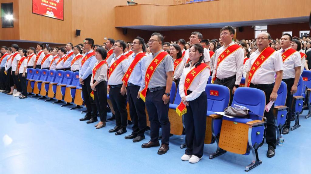 大会在雄壮的国歌中正式拉开序幕,全体参会人员起立齐唱《义勇军进行曲》。
