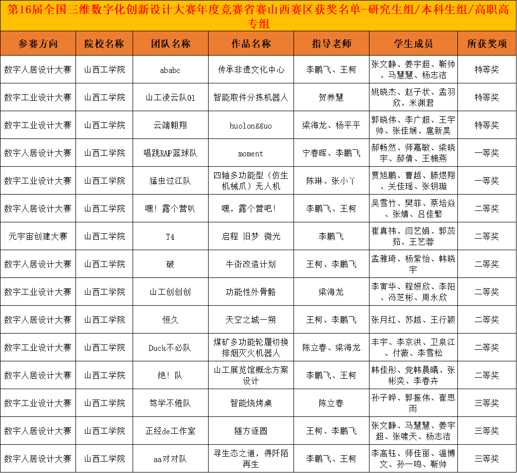 10月31日,全国3D大赛晋蒙赛区总决赛落下帷幕,我校参赛队伍再创佳绩,学校遴选了15支队伍参加比赛,全部获奖。获得特等奖3项,一等奖2项,二等奖7项,三等奖3项。取得了此项大赛历史最好成绩!