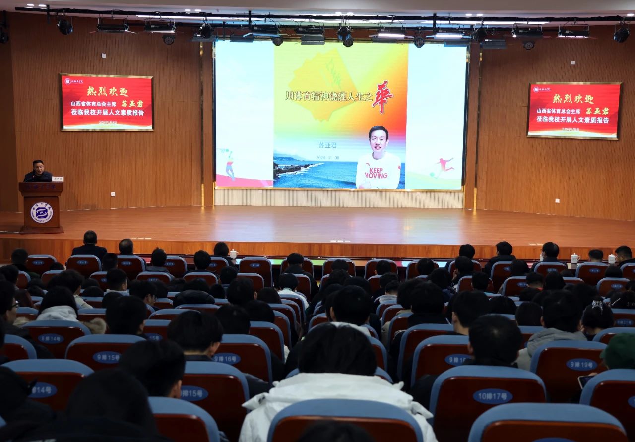 1月8日下午,我校在图书馆一号报告厅开展人文素质报告,特邀山西省体育总会主席苏亚君作了以“用体育精神浇灌人生之华”为题的专题报告。校党委副书记孙刚、副校长田忠刚、吴淑琴出席报告会,各职能部门负责人、各二级学院党总支临时负责人、院长、组织员、辅导员、班主任以及学生代表参加报告会。报告会由孙刚主持。
