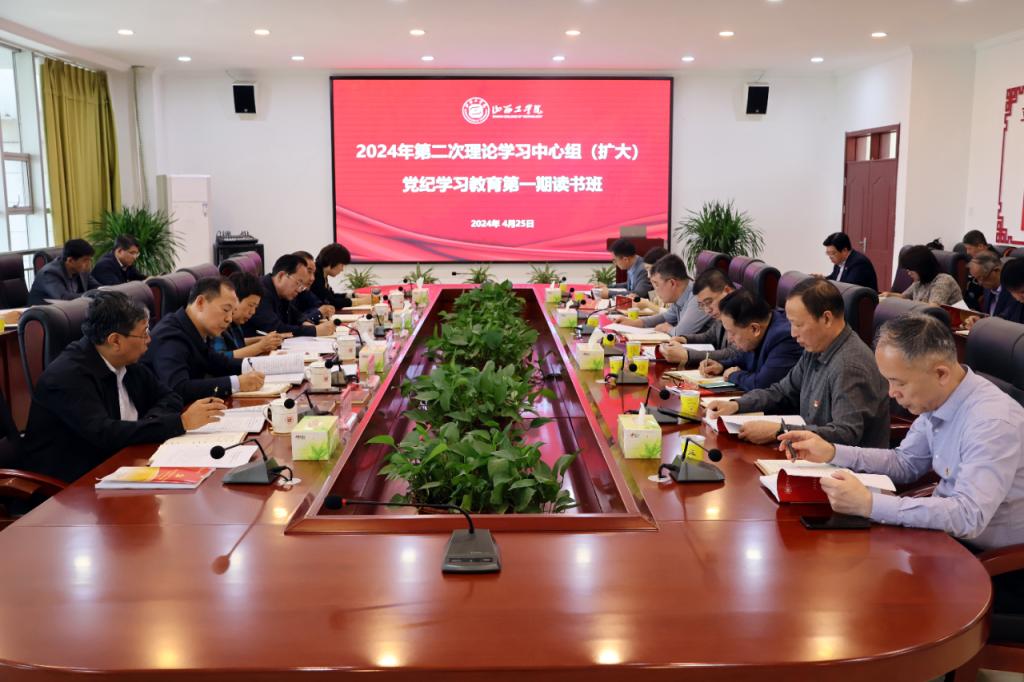 4月25日,我校在治学楼第一会议室举行2024年第二次党委理论学习中心组(扩大)党纪学习教育第一期读书班。全体在校领导班子成员,各职能部门负责人,各二级学院院长、党总支临时负责人参加读书班学习。读书班由校长吴跃焕主持。