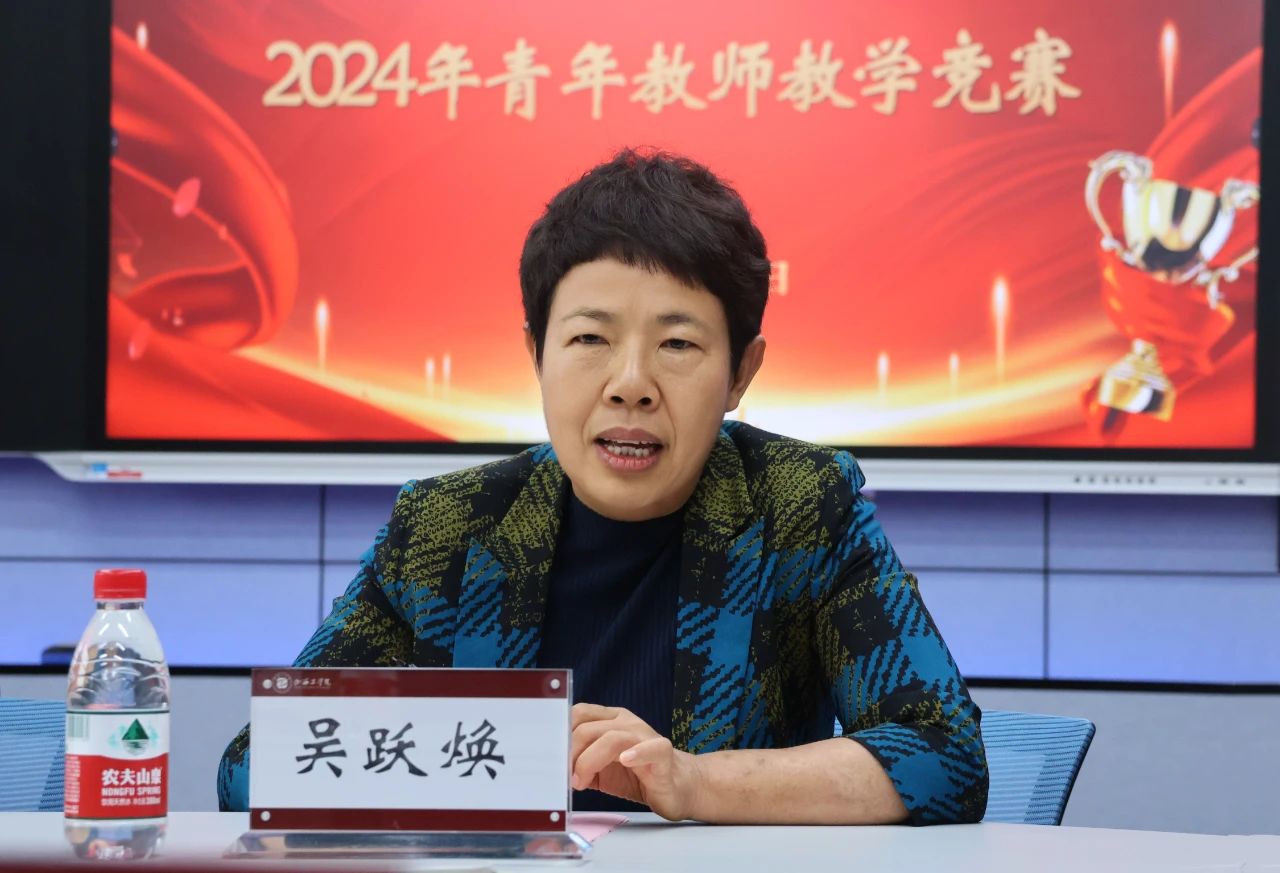 吴跃焕在讲话中指出,今年是学校的基础建设年、规范建设年、顺畅运行年。在2024年度工作会议上,学校就明确提出了“坚持应用型高校办学1个目标、遵循‘产教融合是途径’和‘立德树人是根本’2个理念,通过课程建设、学科竞赛、产业学院3个小切口分别牵引专业建设、双创教育和应用型人才培养模式大事件,最终实现应用型学校内涵建设大突破”的123工作思路。课程建设作为今年工作的一个小切口,要抓牢、抓实、抓细。她强调,课堂教学是人才培养的主渠道、教育教学工作的主阵地、教育改革发展的主战场。希望广大青年教师通过竞赛,相互借鉴、共同提高,切实增强立德树人的使命担当,持续提升教育教学实践本领,为加快推进学校高质量发展作出新的更大贡献。同时,她对不辞辛劳,给予我校教师悉心指导的各位专家评委表示感谢,预祝参赛教师取得理想成绩,大赛圆满成功。