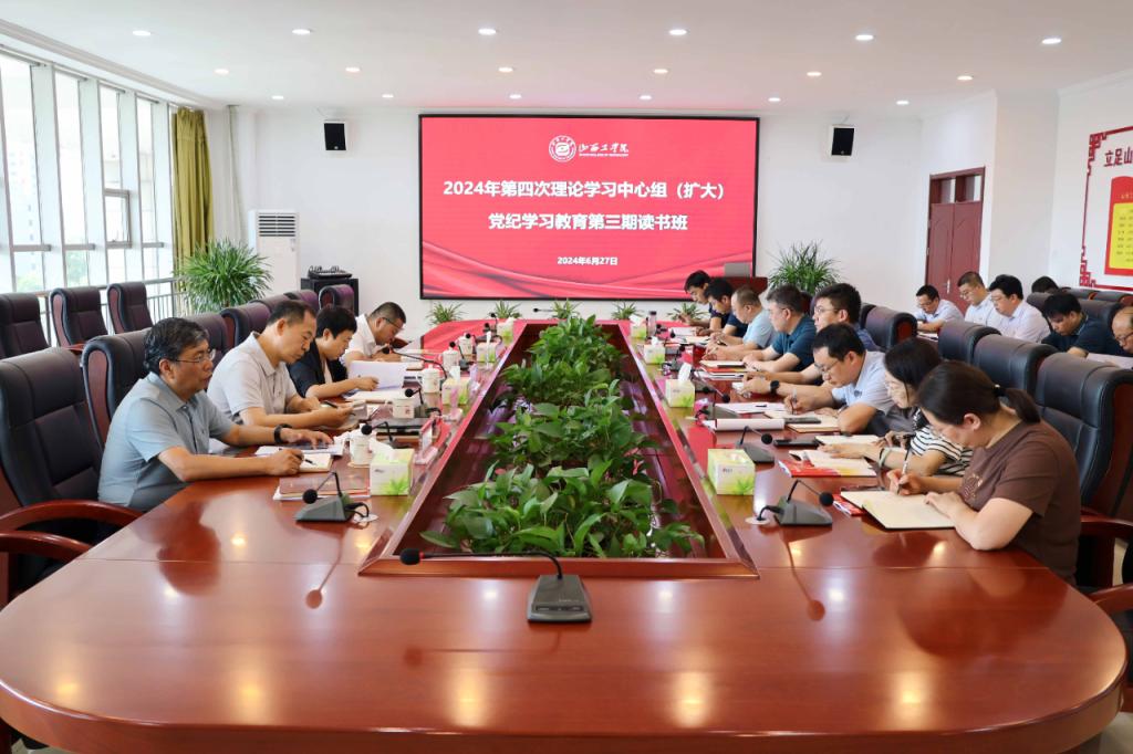 6月27日上午,我校在治学楼第一会议室举行2024年第四次党委理论学习中心组(扩大)党纪学习教育第三期读书班。全体在校领导班子成员,各职能部门负责人,各二级学院院长及党总支临时负责人参加读书班学习。读书班由校长吴跃焕主持。