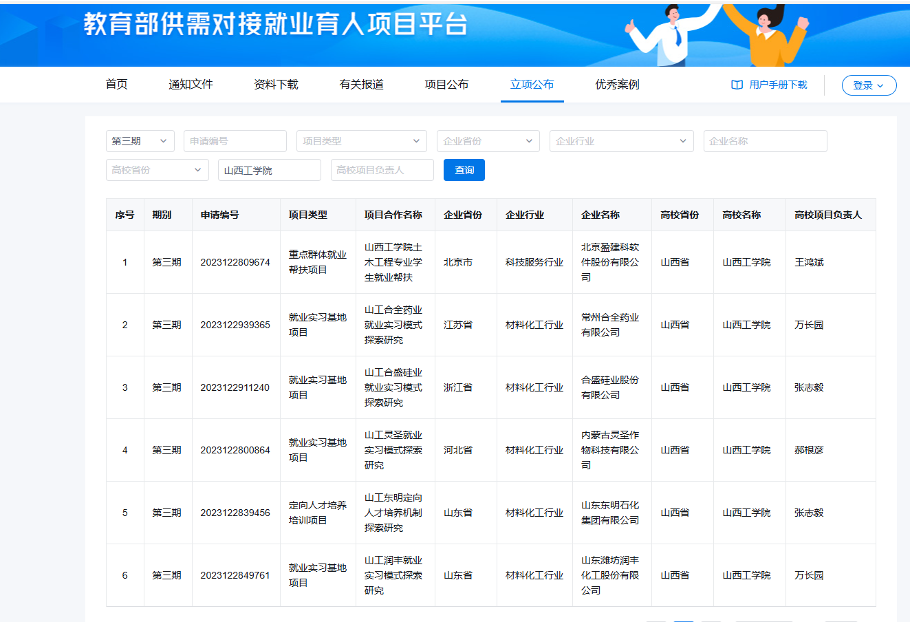 近日,教育部高校学生司发布《关于公布教育部第三期供需对接就业育人项目立项名单的通知》(教就业司函〔2024〕23号)。我校共6个项目获批立项。其中,定向人才培养培训项目1项,就业实习基地项目4项,重点群体就业帮扶项目1项。