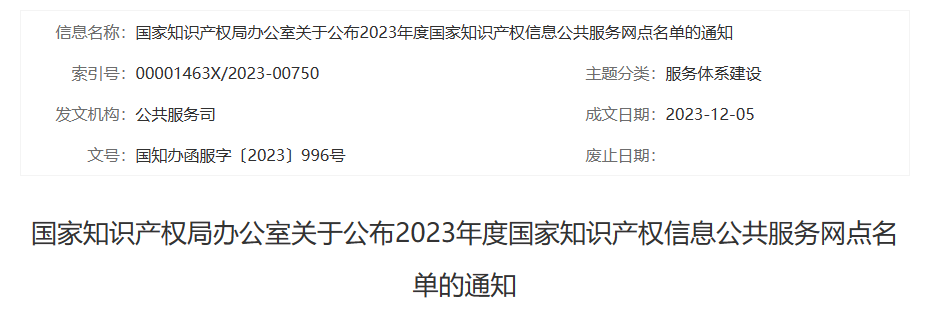 2023年12月12日,国家知识产权局正式公布“2023年度国家知识产权信息公共服务网点名单”,我校成功获批国家知识产权信息公共服务网点。