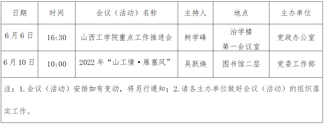 学院2021-2022学年春季学期第十六周(6月6日至6月10日)会议安排表