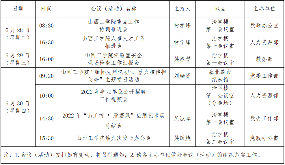 学院2021-2022学年春季学期第十九周(6月27日至7月1日)会议安排表