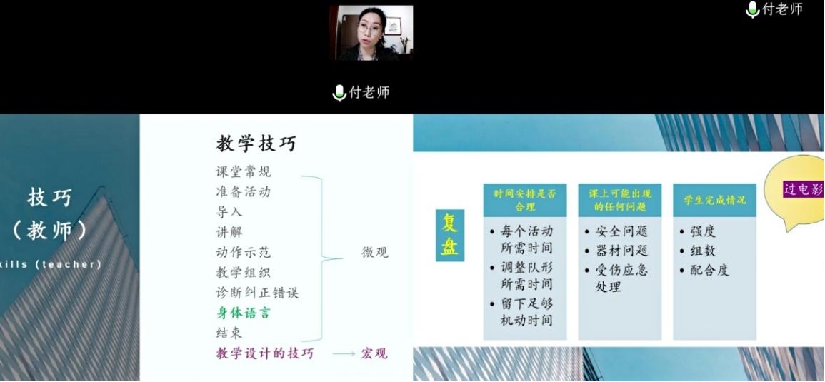 讲座包括宏观和微观两个方面,分别结合实例对教学技巧进行了系统详尽的梳理、阐述。宏观方面包含“厘清教学目标、注重教学策略以及执行策略所应采取的措施”。微观方面包括“课堂常规、准备活动、讲解示范、组织、纠正错误与身体语言”等,讲座特别强调要“重视不断学习进步、复盘反思”,提升自己的教学能力。