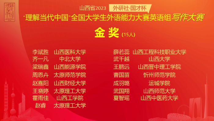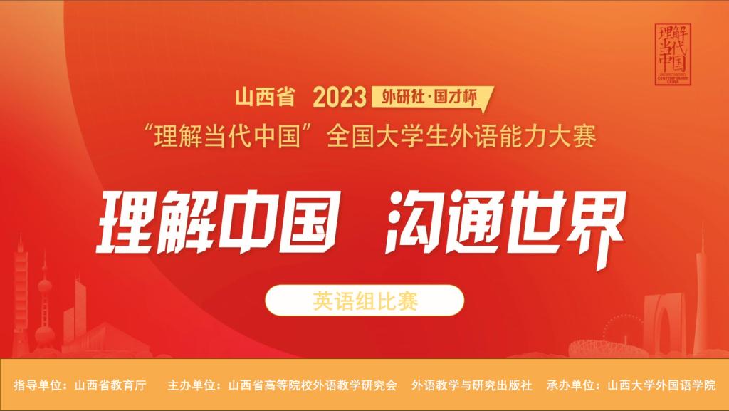 11月4日,由山西省教育厅指导,山西省高等院校外语教学研究会与外语教学与研究出版社主办,山西大学外国语学院承办的2023“外研社·国才杯”“理解当代中国”全国大学生外语能力大赛山西赛区比赛在山西大学落下帷幕。经过激烈比拼,我校最终获得金奖1项,铜奖10项。