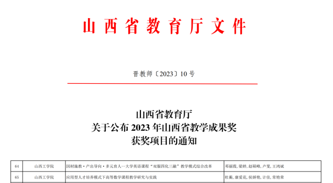 近日,根据《山西省教育厅关于公布2023年山西省教学成果奖获奖项目的通知》(晋教师〔2023〕10号),由通识教育学院英语课程组教学团队申报的教学成果《因材施教·产出导向·多元育人-大学英语课程“双服四化三融”教学模式综合改革》和数学课程组教学团队申报的教学成果《应用型人才培养模式下高等数学课程教学研究与实践》分别获得2023年山西省教学成果奖(高等教育本科)二等奖。