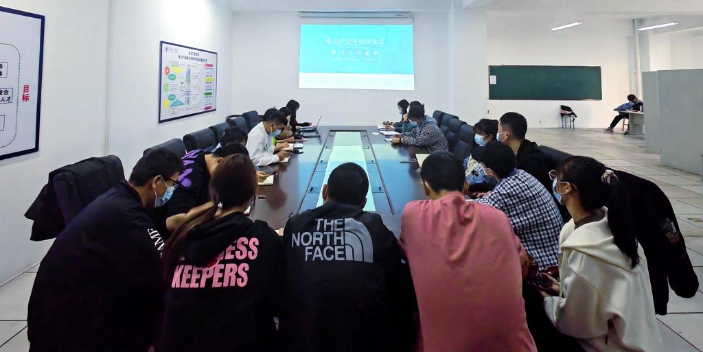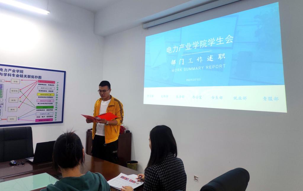 2022年3月10日下午五点,电力产业学院首届团学干部述职汇报会于思学楼303会议室召开。出席本次会议的有辅导员党娜老师及全体团学干部。会议由学生会主席乔晓晨同学主持。