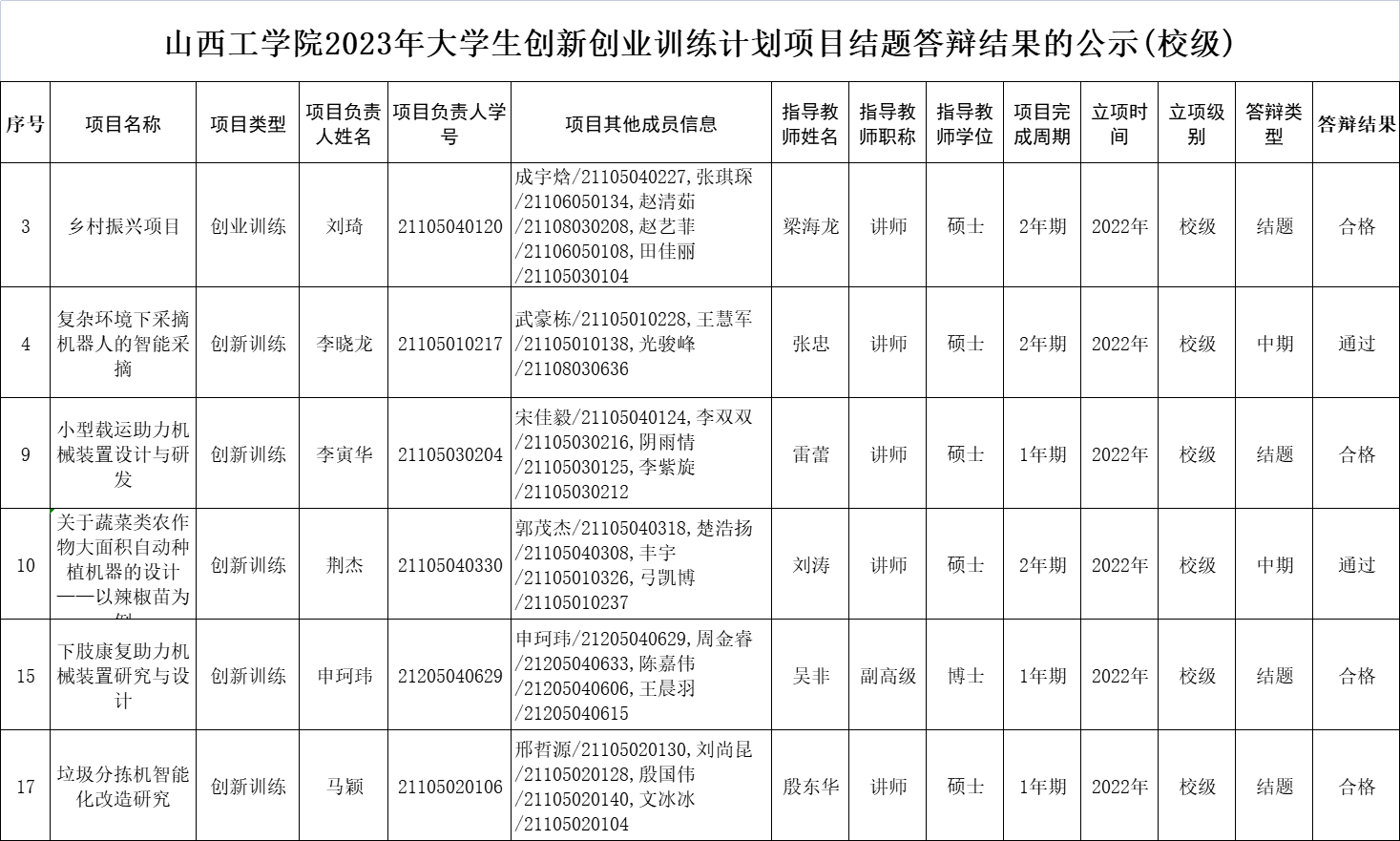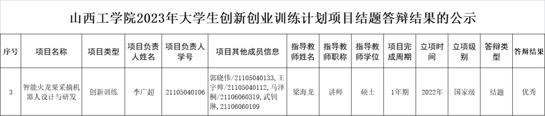 我院共有5个大创项目通过结题验收,2个项目通过中期答辩。其中,一年期国家级立项项目“智能火龙果采摘机器人设计与研发”获得“优秀”评级,“乡村振兴项目、小型载运助力机械装置设计与研发、下肢康复助力机械装置研究与设计、垃圾分拣机智能化改造研究”4个项目获得“合格”评级,2年期项目“复杂环境下采摘机器人的智能采摘、关于蔬菜类农作物大面积自动种植机器的设计--以辣椒苗为例”2个项目获得顺利通过中期答辩。祝贺以上项目小组!希望未来有更多学子参与学术创新,积极申报大创项目,在活动中培养学术思维,锻炼研究能力,为学院建设贡献出自己的一份力量。