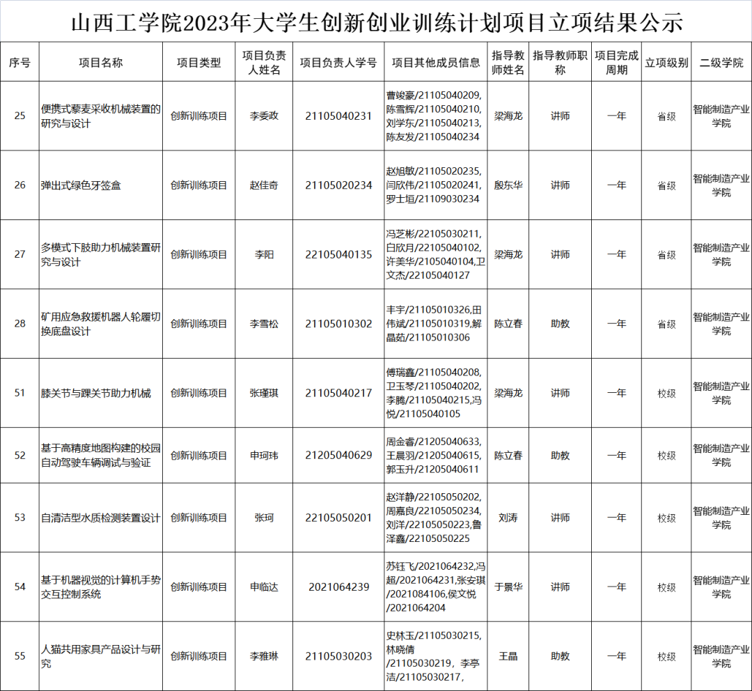 我院共有9个大创项目获得学院2023年大学生创新创业训练计划项目立项,其中,“便携式黎麦采收机械装置的研究与设计、弹出式绿色牙签盒、多模式下肢助力机械装置研究与设计、矿用应急救援机器人轮履切换底盘设计”4个项目获得省级立项,“膝关节与踝关节助力机械、基于高精度地图构建的校园自动驾驶车辆调试与验证、自清洁型水质检测装置设计、基于机器视觉的计算机手势交互控制系统、人猫共用家具产品设计与研究”5个项目获得校级立项。