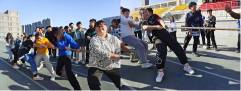 学院教职工和学生自愿随机组队进行了拔河比赛。当比赛的哨声一响,队员们口中一起高呼“一二,一二”,双手紧握长绳,铆足了劲儿,拼命往后拉,一个个累得面红耳赤、气喘吁吁。在场没有参加比赛的师生们自发组成了拉拉队,为参赛人员助阵加油,呐喊声此起彼伏,飘荡在整个赛场上空。