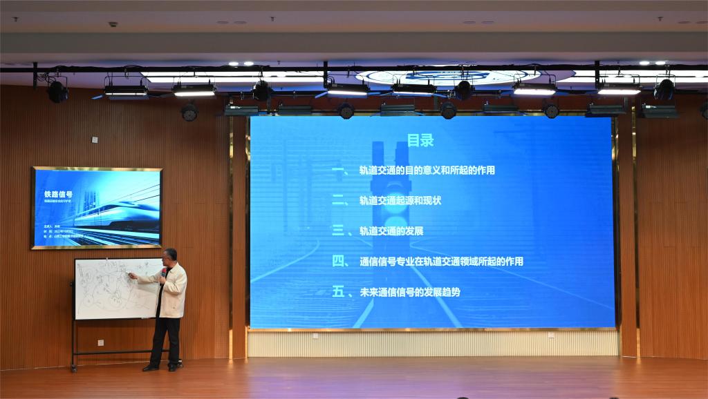 孙彬老师结合自身深厚的行业经验和渊博的专业知识,围绕轨道交通的目标意义和所起的作用、轨道交通的起源和现状、轨道交通的发展、通信信号专业在轨道交通领域所起的作用、未来通信信号的发展趋势等四个方面进行深入浅出的讲解。过程中,孙老师时不时就讲座中涉及轨道交通的一些概念、知识与学生进行互动与交流,不断引导学生对专业知识进行思考和表达,激发其对专业知识学习的动力,赢得了阵阵掌声。