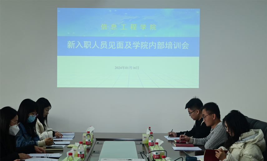 2024年1月16日下午,信息工程学院在博学楼B403会议室召开新入职人员见面及学院内部培训会,会议由王晓凯院长主持,学院全体在岗教职工参会,会议共有五项议程。
