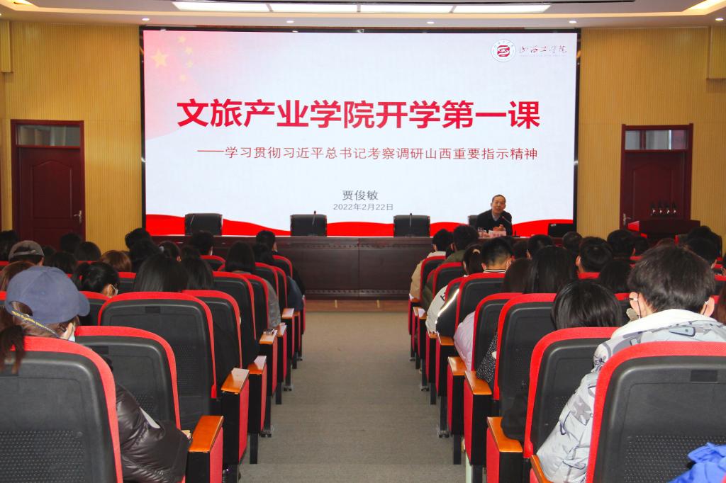 根据校党委的安排部署,为深入学习贯彻习近平总书记考察调研山西重要指示精神,教育引导广大学生铭记习近平总书记的深恩厚爱,把习近平总书记的殷切关爱转化为践行“两个维护”的自觉行动,努力开创育人新局面,带领引导广大学生永远听党话、感党恩、跟党走,2月21日下午,文旅产业学院组织召开2022年春季学期“开学第一课”——习近平总书记考察调研山西重要指示精神暨山西省十二届三次全会学习贯彻会,我校纪委书记贾俊敏为文旅产业学院学生宣讲开学第一课。