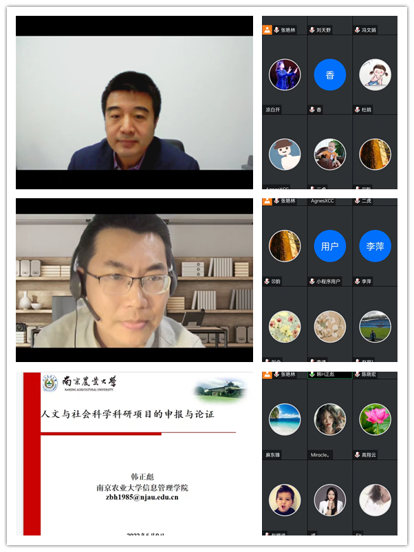5月9日19:30,由科研与对外合作部主办,经济与管理学院承办的文与社会科学科研项目申报与论证培训会在线上举办,经济与管理学院所有教师参加培训会,学校其他学院的20余名教师通过手机、电脑等方式参加培训会。培训会由南京农业大学信息管理学院副教授、博士生导师韩正彪主讲,科研与对外合作部负责人主持。