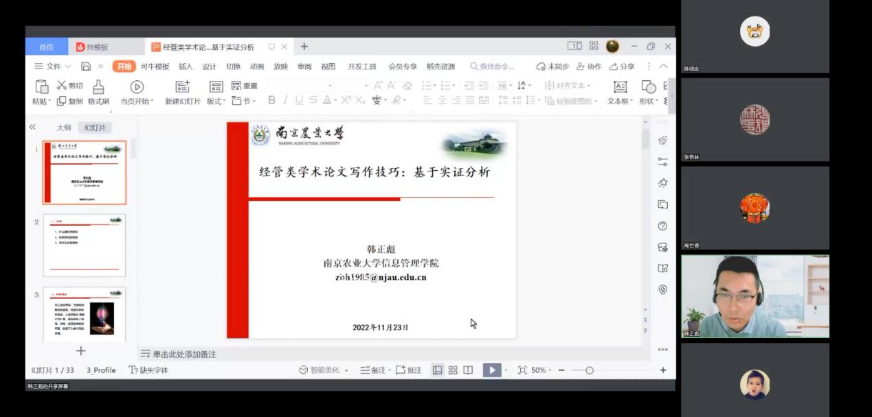 为培养全院师生的学术思维、提高论文写作能力,11月23日,经济与管理学院特邀南京农业大学信息管理科学系韩正彪教授进行“经管类学术论文写作技巧——基于实证分析”培训会。此次培训会由学院党务临时负责人主持,学院全体教职工及部分学生参会。