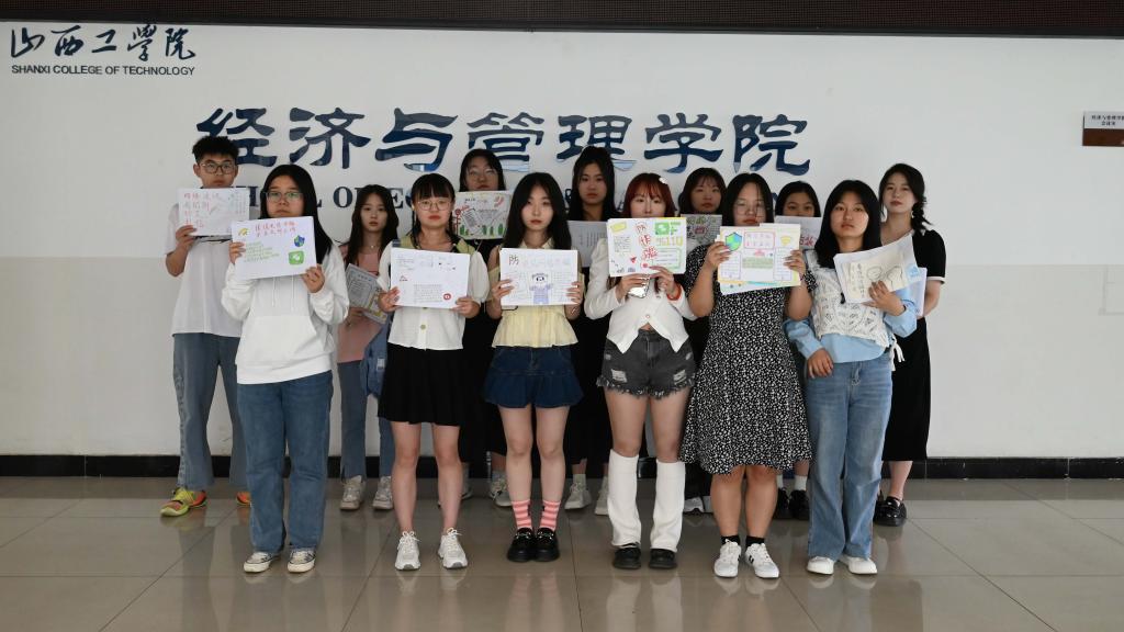 活动中,志愿者统一在明学楼A506进行签到。活动分两场进行,第一场活动志愿者负责绘制关于诈骗的形式、套路以及关于反诈的建议、想法的宣传海报。第二场活动志愿者在校内外各个地方向每个同学宣传讲解海报上的内容,提升大家的反诈能力,预防大家上当受骗。最后志愿者在经济与管理学院标识下进行合影留念。