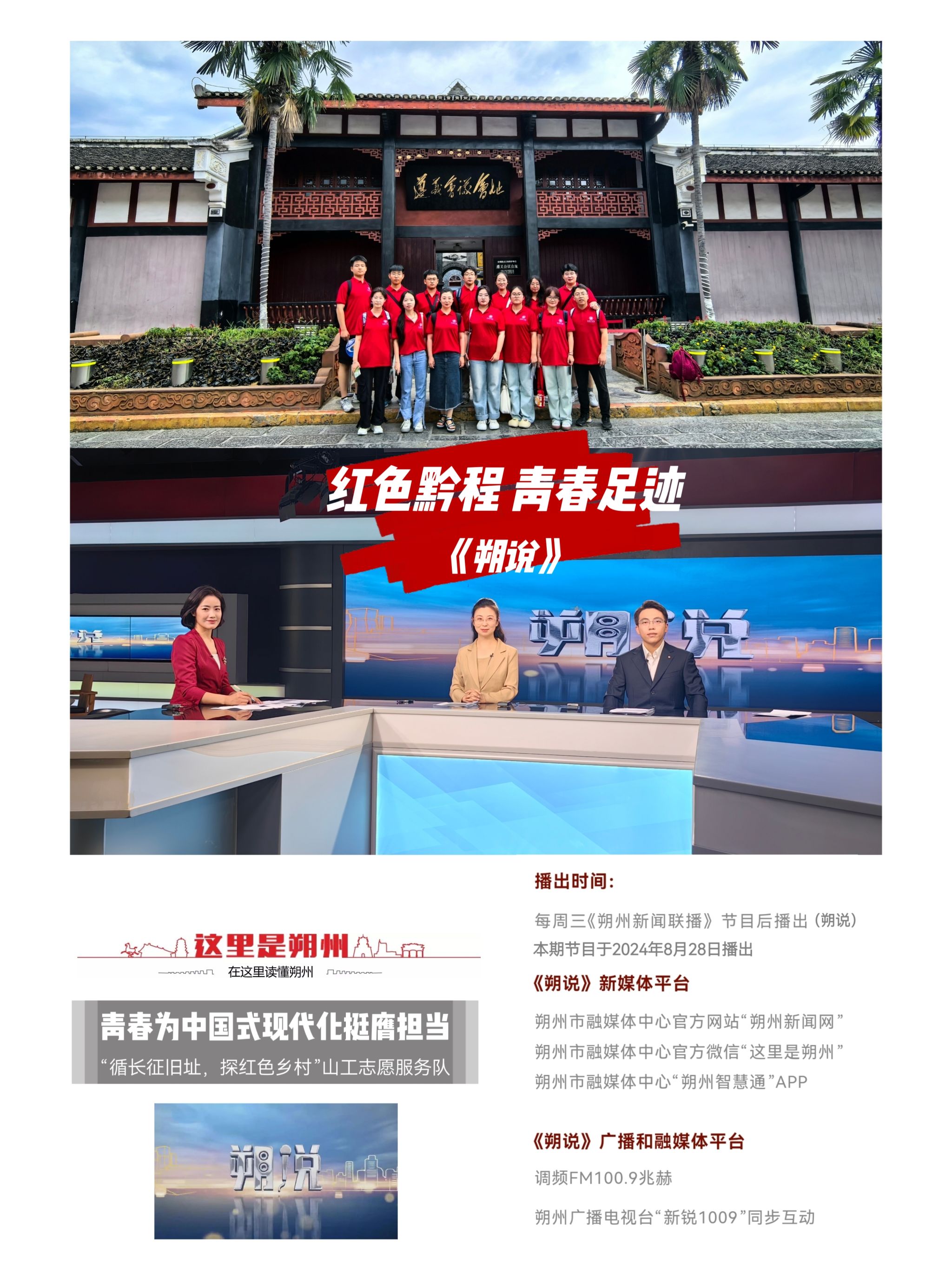 我校“循长征旧址,探红色乡村”山工志愿服务队积极申报2024年大学生暑期“三下乡”社会实践“青春长征”专项活动,并成功入选此项目全国第一批研学团队。该团队师生一行14人于7月13日至23日赴贵州省遵义市红花岗区、播州区团结村、苟坝村、花茂村和贵阳市南明区,围绕长征精神、大发精神、推广普通话、普法宣传、乡村振兴、扩大学校影响力和服务基层等方面开展了一系列丰富多彩、意义深远的实践活动。实践归来后,团队师生代表受邀做客朔州市电视台大型融媒访谈节目《朔说》,进行了一期《红色黔程,青春足迹》节目专访,在专访中分享了在实践中的见闻和感悟。
