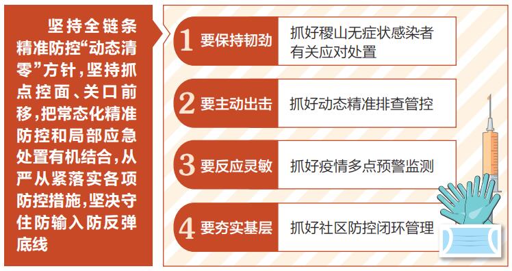 蓝佛安指出,各级各部门要坚决贯彻落实党中央、国务院决策部署及省委工作要求,从讲政治的高度审时度势,守土有责、守土负责、守土尽责,全力抓好外防输入、内防反弹各项工作,巩固既有成果,及时综合施策,高质量完成疫情“动态清零”,确保“两节”平稳有序、全省大局稳定。要严格落实“四早”要求,在全面抓好疫情防控举措落地的同时,切实发挥农村基层组织优势,群策群力、群防群控,查堵漏洞、补齐短板,严密防范疫情在农村地区传播,合力筑牢我省疫情防控坚固防线。