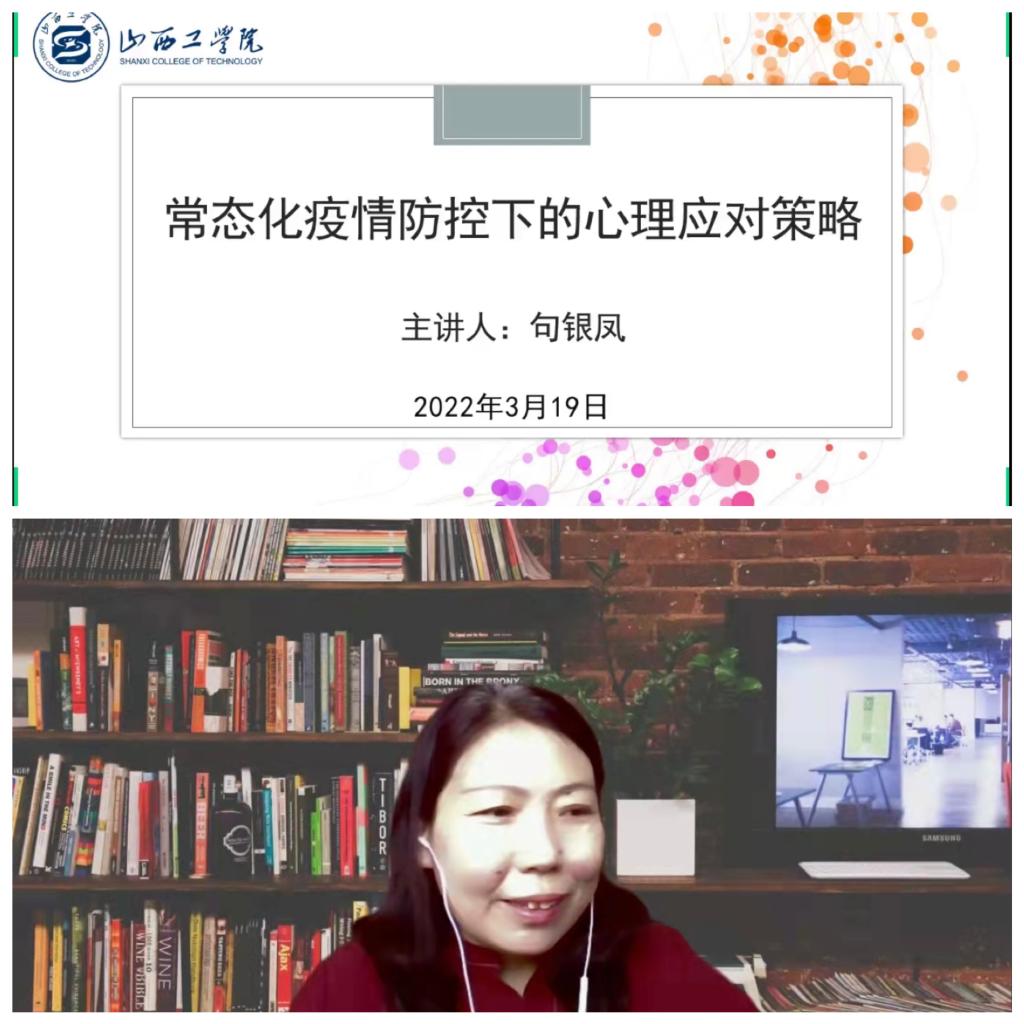 为进一步加强我校学生心理健康教育,强化疫情常态化下心理干预机制,把大学生心理健康工作做好、做细、做实,3月19日下午,我校特邀国家二级心理咨询师、朔州市心理学会常务秘书、朔城区教育局心理疏导组句银凤老师为我校师生开展了以“常态化疫情防控下的心理应对策略”为主题的线上培训。本次线上培训在腾讯会议举行,全体辅导员以及各班心理委员参加了此次线上培训。
