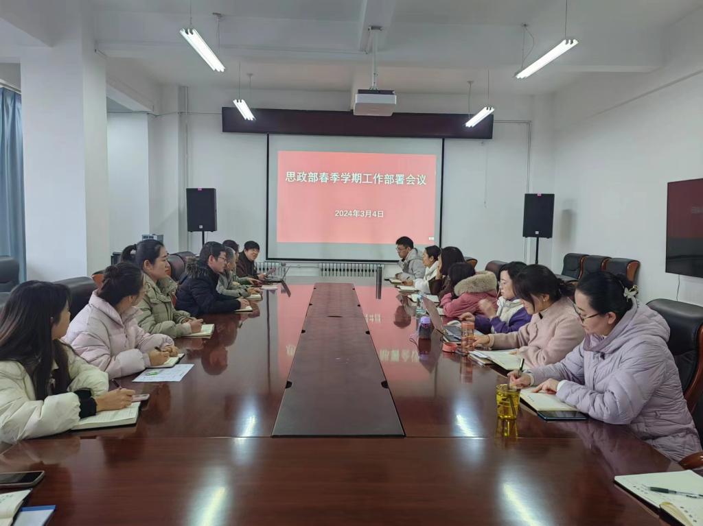 新学期,新目标,新起点,新征程。为有效推进新学期各项工作高效开展,统一思想,凝心聚力,团结奋进,3月5日下午,思政部新学期工作部署会在治学楼第三会议室召开。思政部主任董毅出席会议,柔引教师贾群英及思政部全体教师参会。